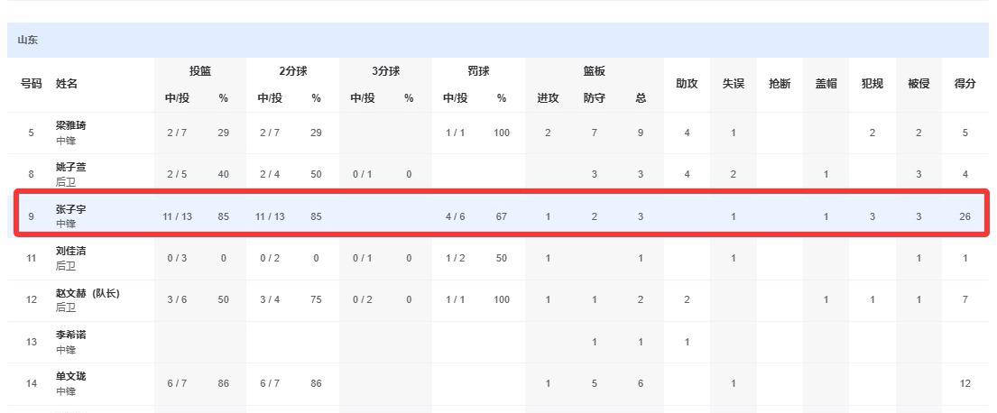 今天下午的比赛中,张子宇率领的山东队对阵由济源一中组成的河南队,最终,山东队以78比50轻松战胜河南队。张子宇在比赛中表现出色,出手13次命中11次,罚球6次中4次,贡献26分,并成为全场得分王。