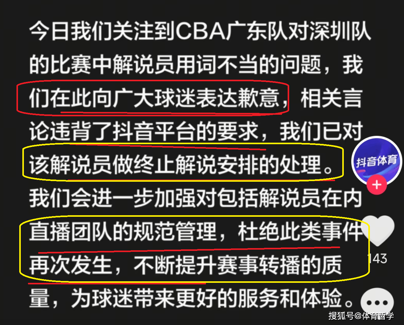 在深夜,抖音平台也是做出了回应,首先向广大的球迷进行了道歉。其次,也是直接终止了宋庭解说资格。