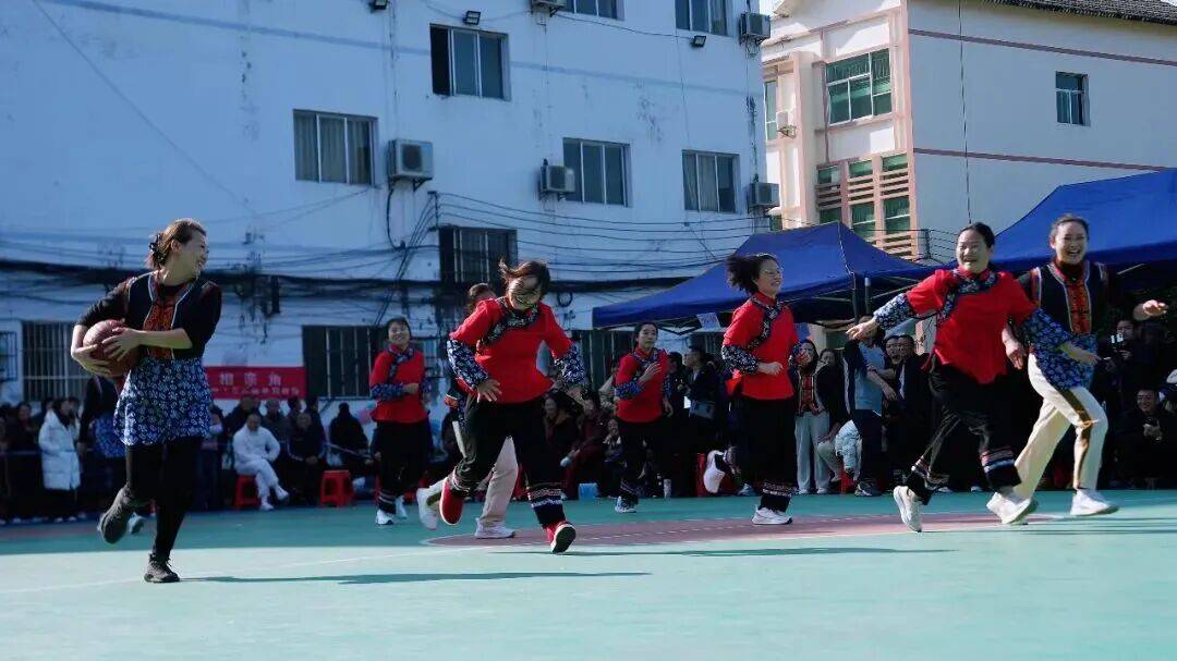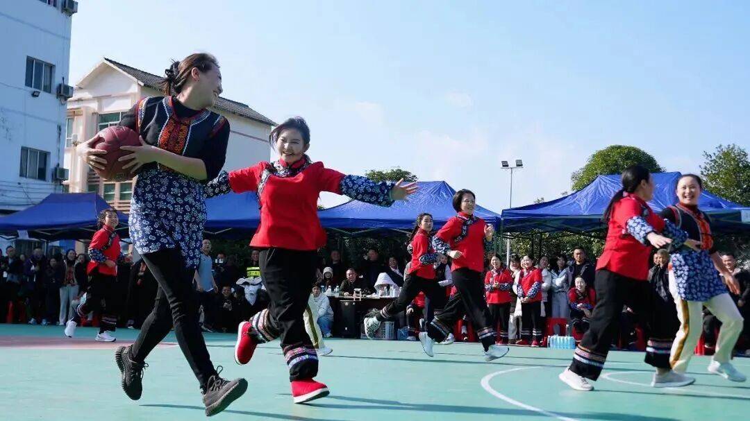 当天上午,开幕式后哨声一响,首场比赛火热开场。球场上,“嬢嬢”们的装扮各具特色:有的身着花色球衣、系着家常围腰;有的戴着袖套,一身质朴打扮。队员年龄跨度极大,既有朝气蓬勃的青春少女,也有头发花白的阿姨,但所有人的拼搏劲头丝毫不减,拼抢、传球、投篮一气呵成,赛场边喝彩声、掌声此起彼伏。