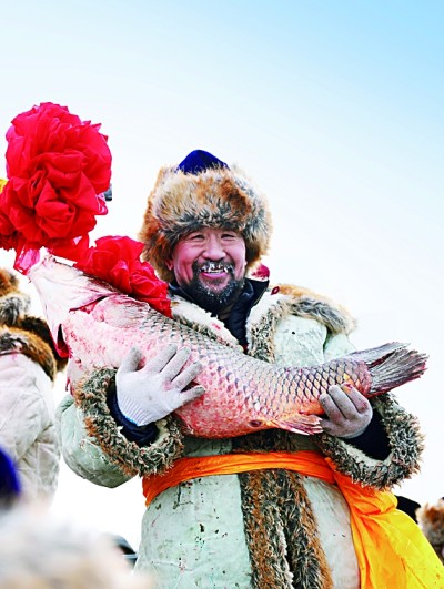 在位于新疆阿勒泰地区福海县的乌伦古湖,“渔把头”展示冬捕的头鱼。本报记者孙金行摄/光明图片