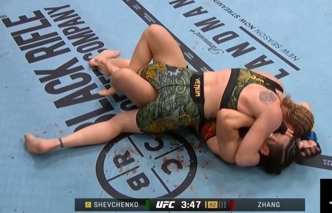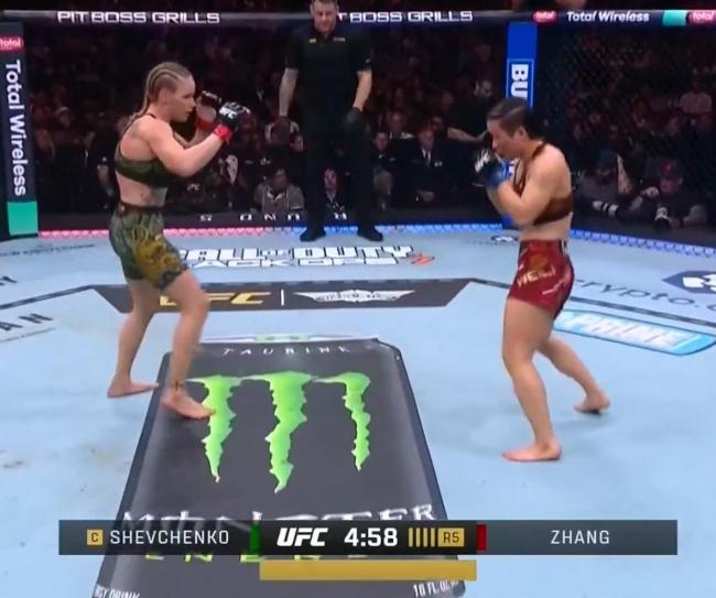 第三回合,张伟丽保持站立控制距离,但回合中段又被放倒。舍甫琴科已有4次摔跤尝试,其中3次成功,将张伟丽控制到回合结束。