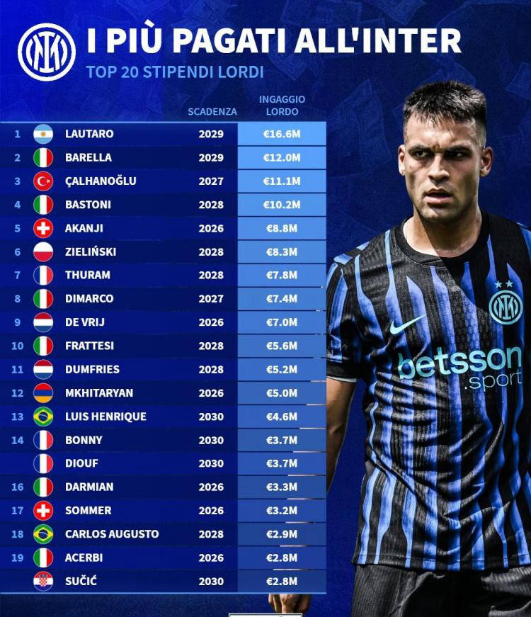 最后,从德国转会市场公布的数据来看,国米队内薪资排名已清晰浮现。劳塔罗以1660万欧元税前年薪领跑全队。巴雷拉和恰尔汗奥卢紧随其后,分别拿到1200万欧和1100万欧的待遇,巴斯托尼与阿坎吉也入围高薪行列。整体来看,国米在球队投入及薪资结构上体现了明显的竞争力,为迎战接下来的关键赛事提供保障。