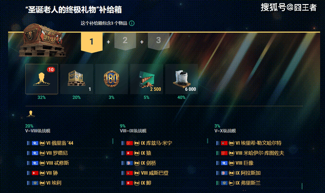 “圣诞老人的终极礼物”补给箱是今年新增的全新圣诞箱,仅限12月限时上架,而且只能用现金购买。这款箱子10级船爆率为3%,9级船爆率9%,还有20%的概率开出“金色礼物”补给箱,不管是刚入坑的新手,还是想快速获取强力战舰提升战力的老玩家,都很适合购买。