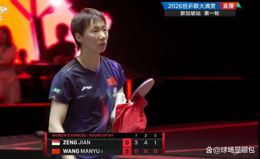 在经历了开局失误高潮后,王曼昱还是可以完成调整,保证上台率,对手没有任何办法,中后局一波拉开分差之后,11-4拿下第二局。第三局因为失误丢了一分,开局还是4-1领先,打停对手。暂停回来,王曼昱一上来就是一板过,后续对手找不到任何办法,不管是质量还是战术,这让王曼昱轻轻松松11-1横扫对手晋级下一轮。整场比赛用时15分钟。